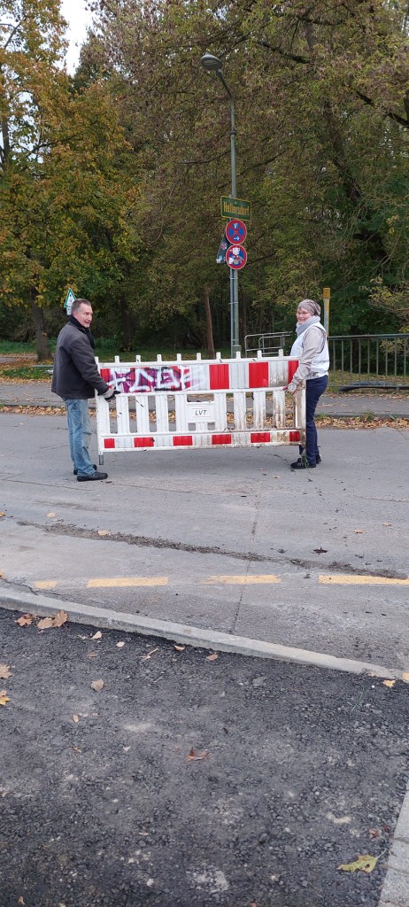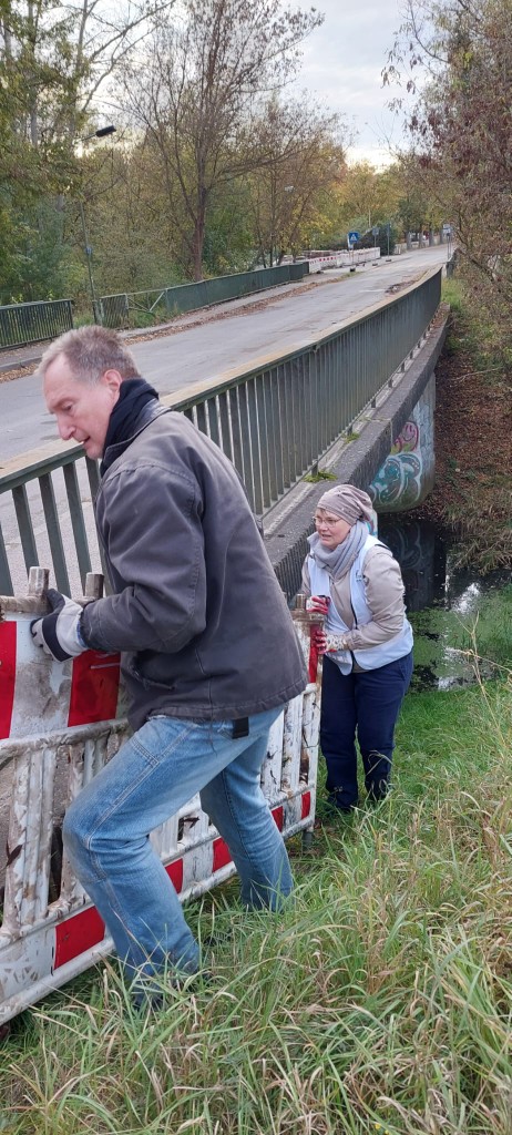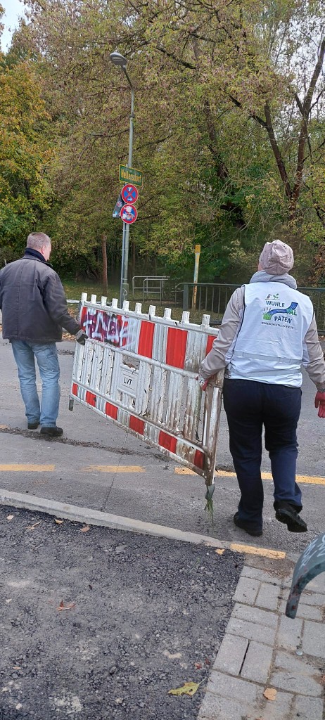 Am 20. Oktober 2025 haben einige Wuhletal-Paten kurzerhand zu einer spontanen Müllsammelaktion aufgerufen und zwei seit Längerem in der Wuhle liegende Bauabsperrungen geborgen.
