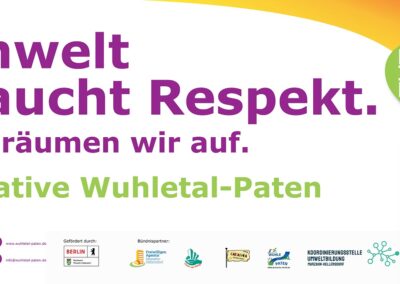 Privatpersonen und Institutionen entlang des Wuhletals, die vor ihrer Haustür Verantwortung für dieses einmalige Berliner Biotop übernehmen und regelmäßig engagiert und eigenverantwortlich 1 – 3 mal monatlich den Müll vor Ort sammeln und entsorgen.