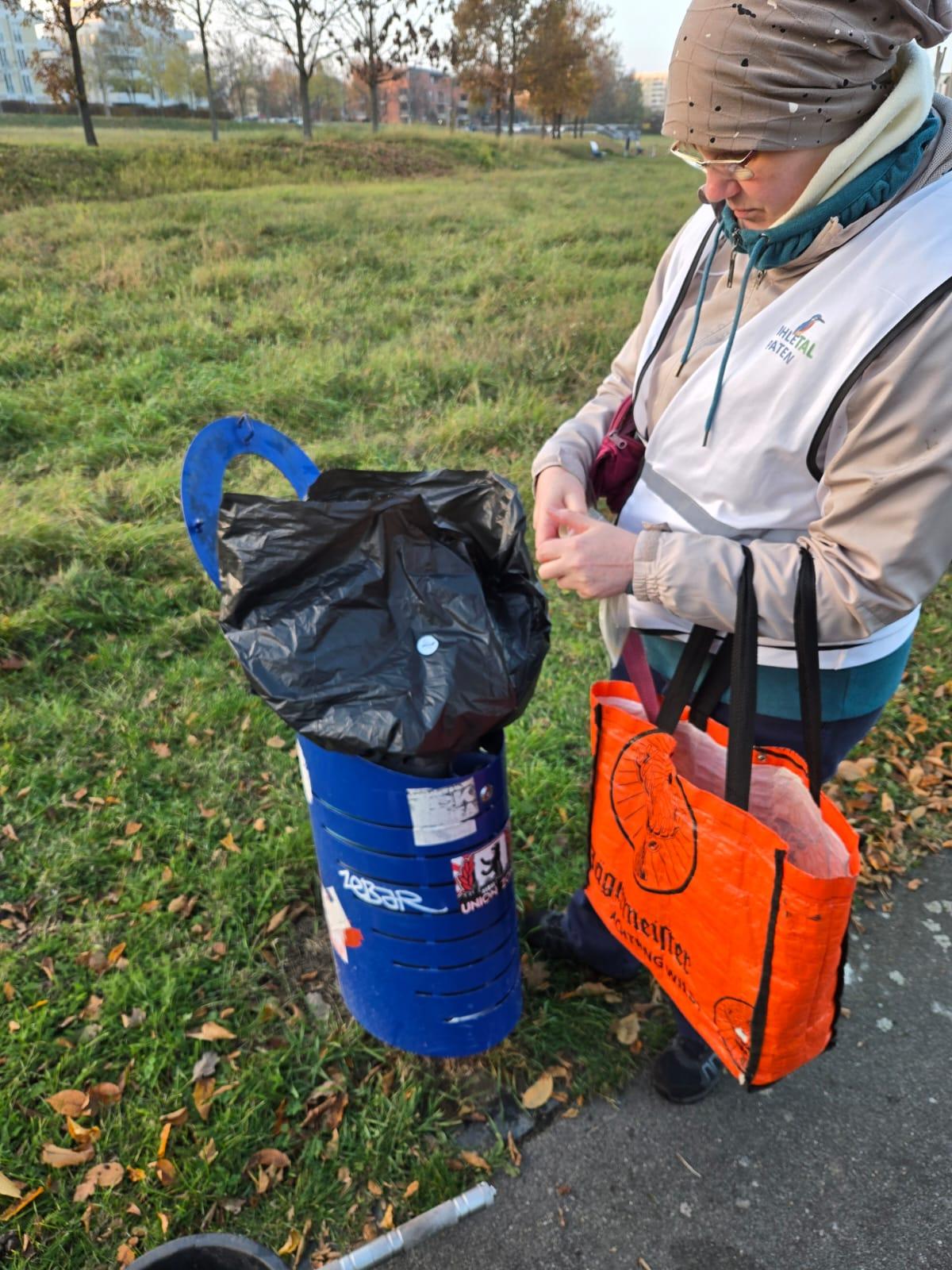 Und wenn Ihr unsere großen Aufkleber auf die Müllsäcke klebt, könt ihr die Müllsäcker auch an den Mülleimern im Wuhletal hinstellen und sie werden bei den wöchentlichen Entsorgungsrunden mitangeholt. Das hat uns die Bezirksversammlung genehmigt.