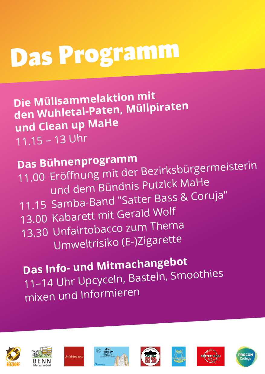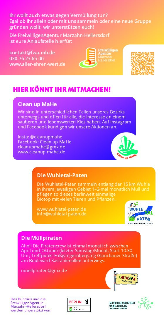 6. Juli 2024 – ab 11 Uhr Wir treffen uns am S- und U- Bhf Wuhletal und werden in alle Richtungen ausschwärmen. Wir freuen uns auf euch und eure rege Teilnahme. Greifer, Handschuhe, Mülleimer (für kleines), Mülltüten etc. könnt ihr von uns ausleihen. Du hast Fragen?...